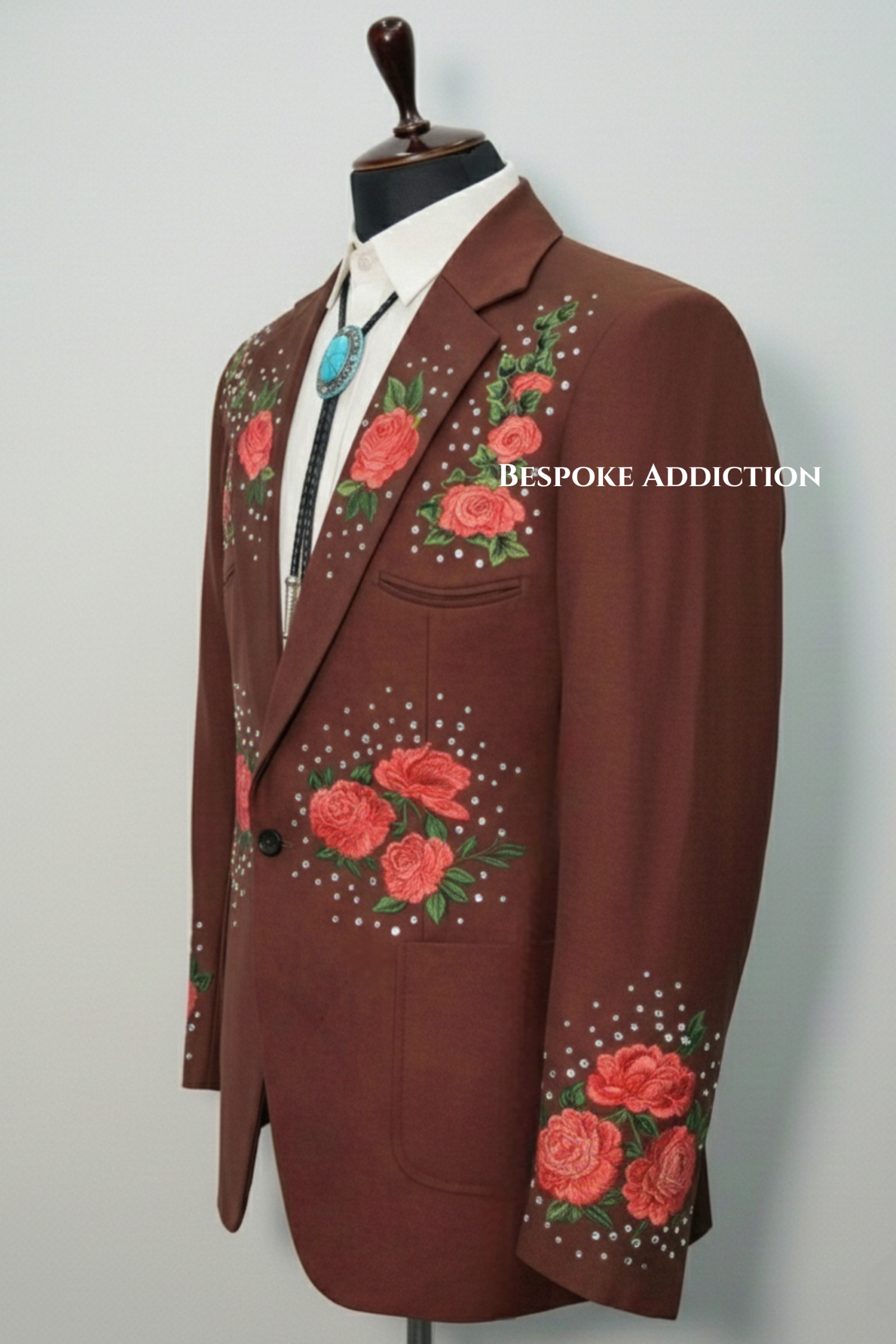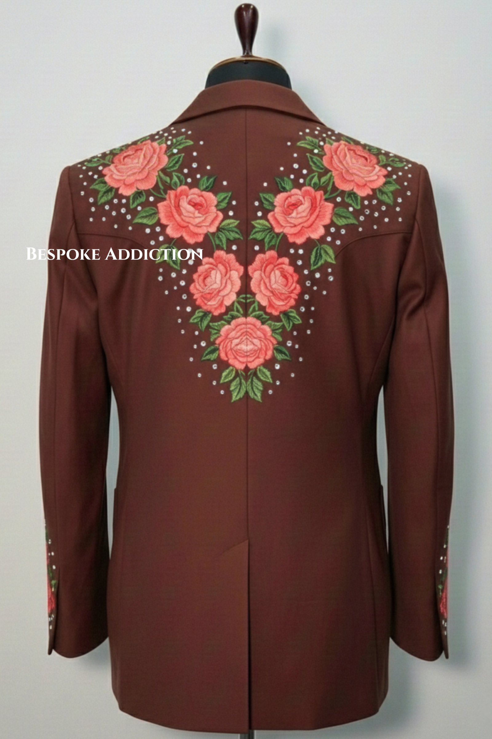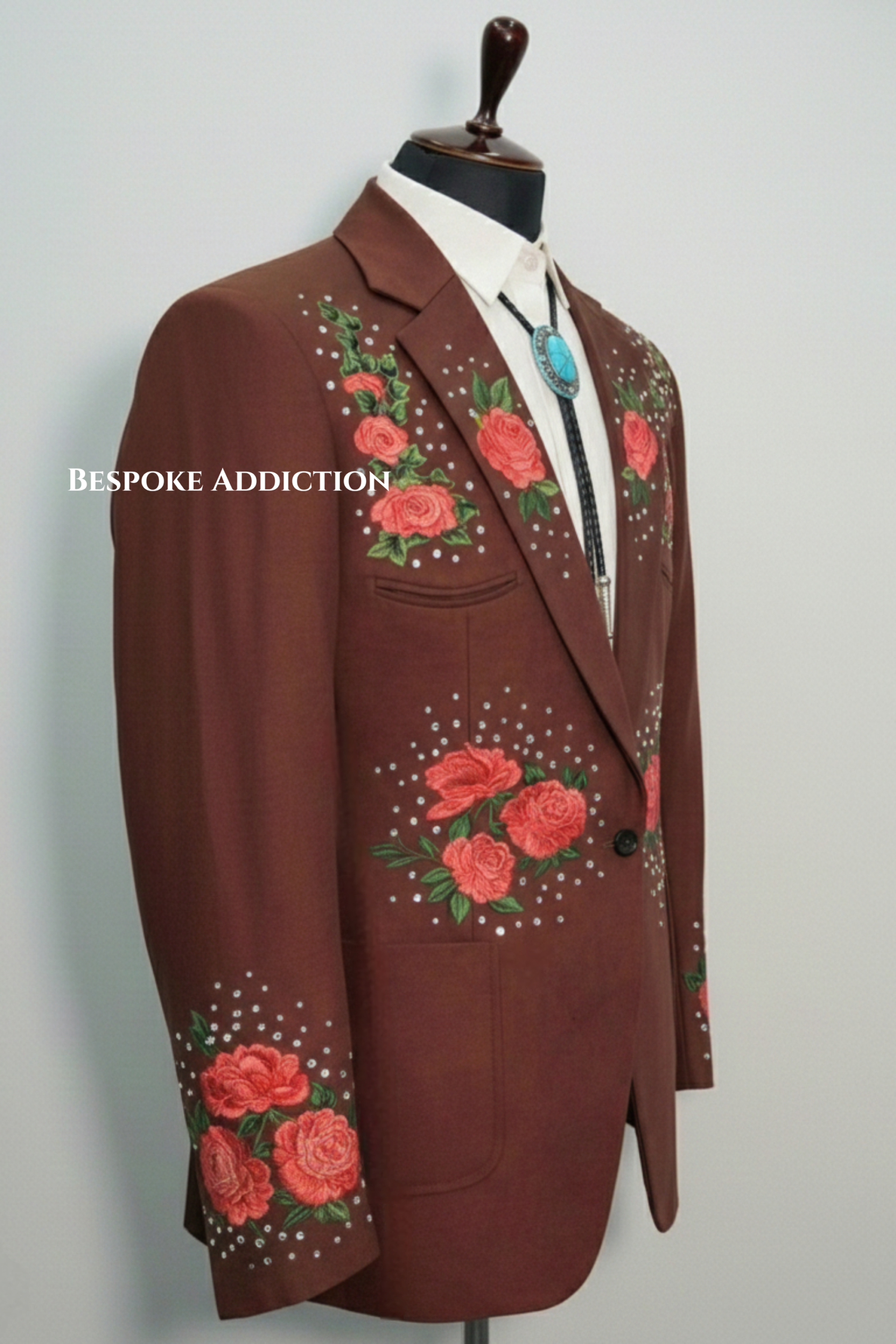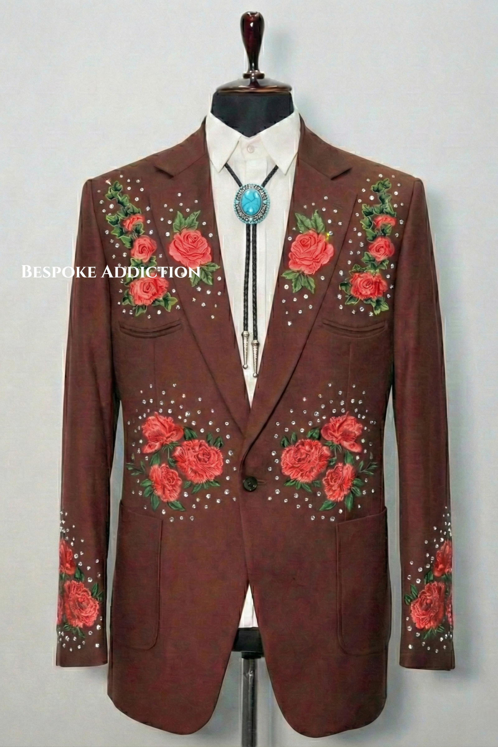 Men 2Pc Brown Customized Rose Embroidered Rhinestones Country Western Nudie Suit Groom Wedding Attire